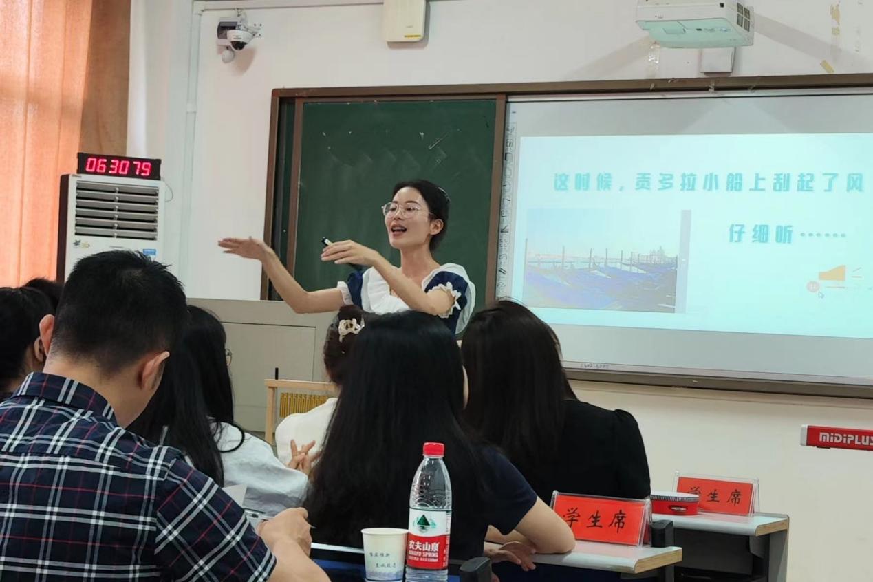 本次大赛分文理科组现场进行,包括教育问答和授课环节两个,在教育问答环节,三位同学沉着冷静,信心十足,充分展现了扎实的理论基础和显著的学习效果,在授课环节雷雨同学从容不迫,全身心投入讲课,将教授内容与课堂氛围巧妙结合,身着民族服饰带领员工用身体感受音乐,最终凭借富有创意的教学设计、灵活的细节把控以及较强的综合素质在本次大赛文科组中脱颖而出,斩获第六名。邓玉苹同学的课堂感染力也很强,也十分强调师生互动,兼具优秀的音乐专业素养,教唱环节与奥尔夫打击乐器编创环节的课堂氛围十分活跃,教学环节设计也紧扣教学目标,收到评委老师的一致好评,取得了第九名的好成绩。周佳铭同学通过与古诗句结合把大家引入所学的古筝曲中,让员工对民族乐器有所了解并体验古筝的弹奏技法,又通过唱和晚的描述使人身临其境,教学设计环环相扣,最终收获了第十名的好成绩。