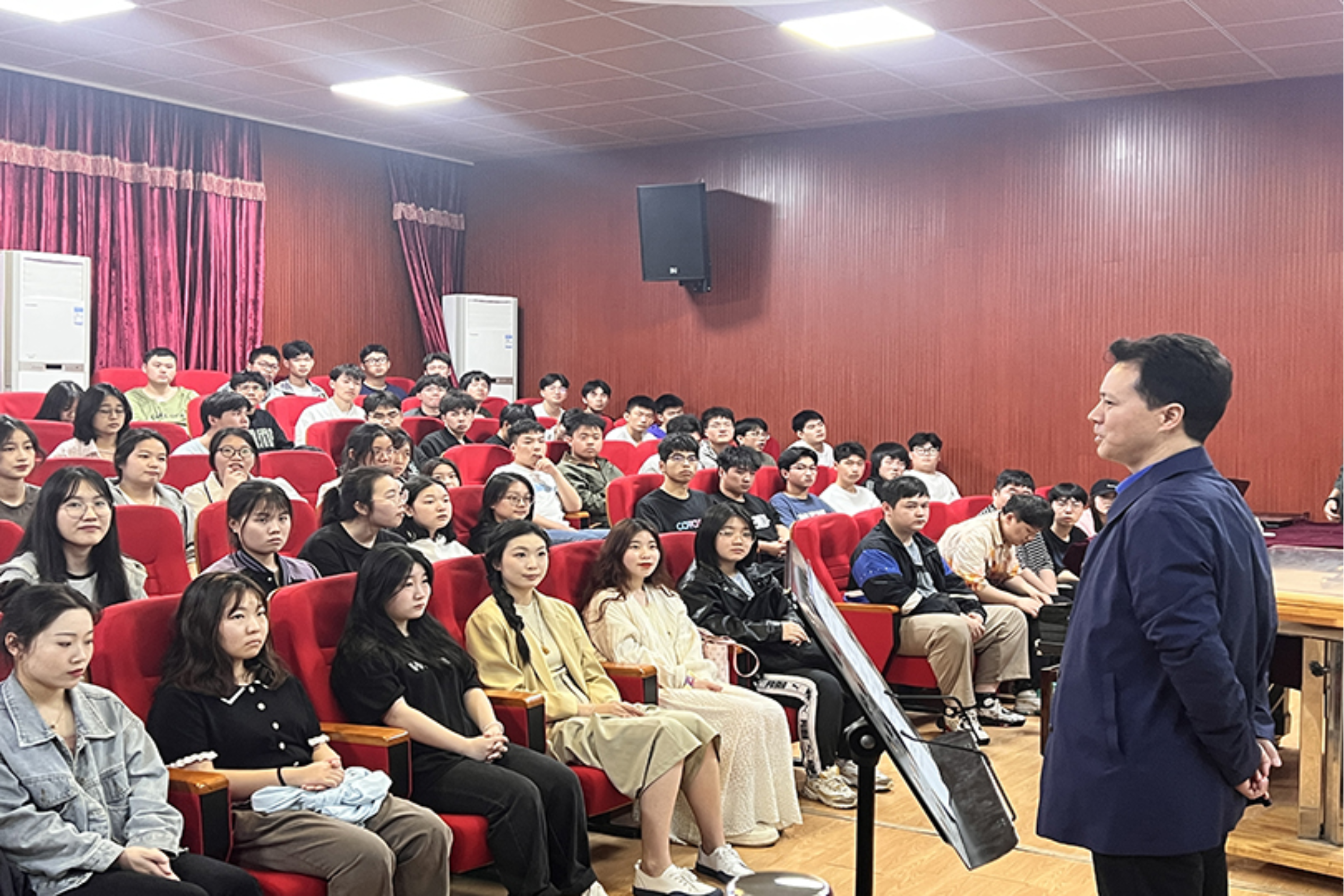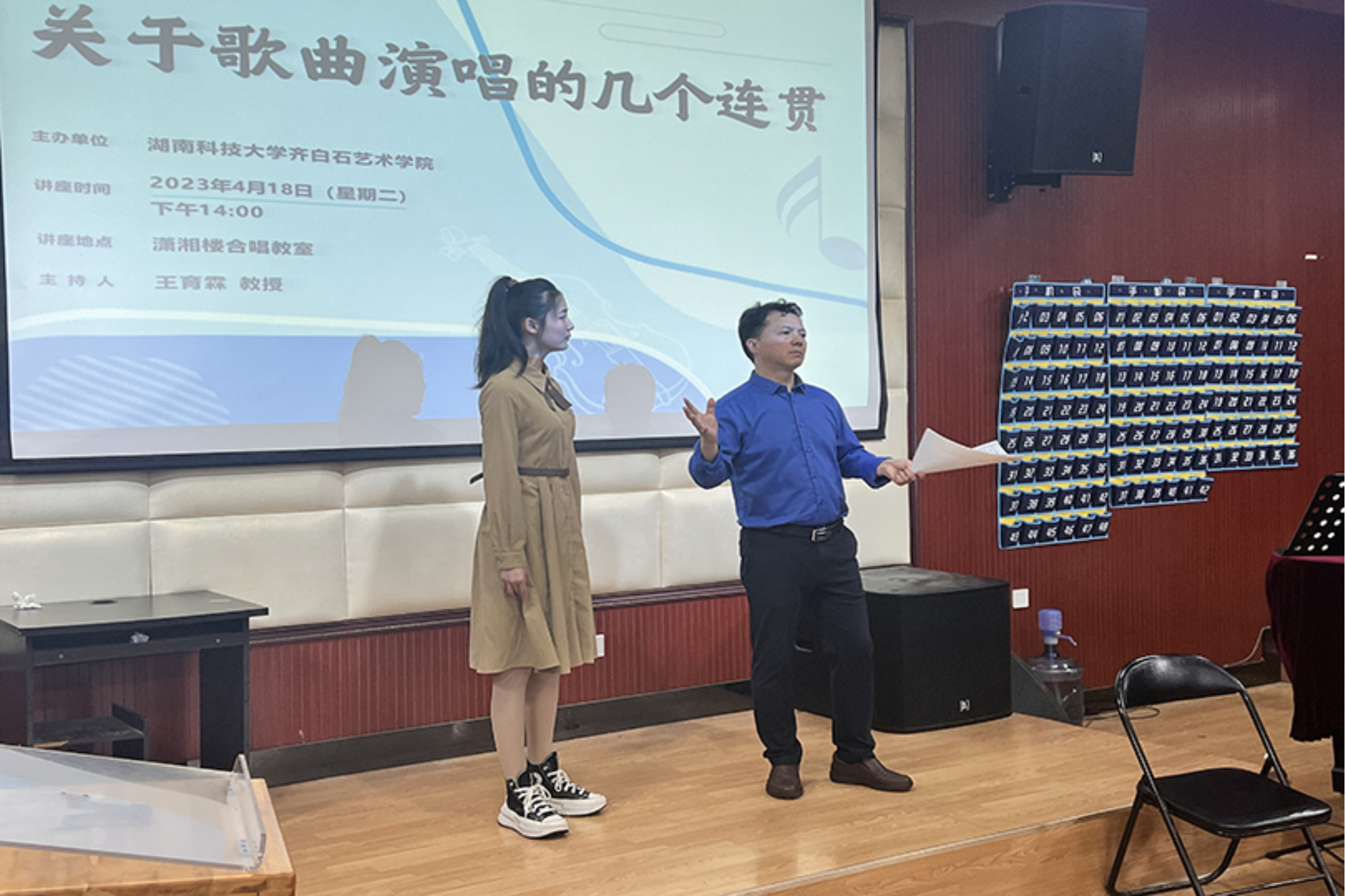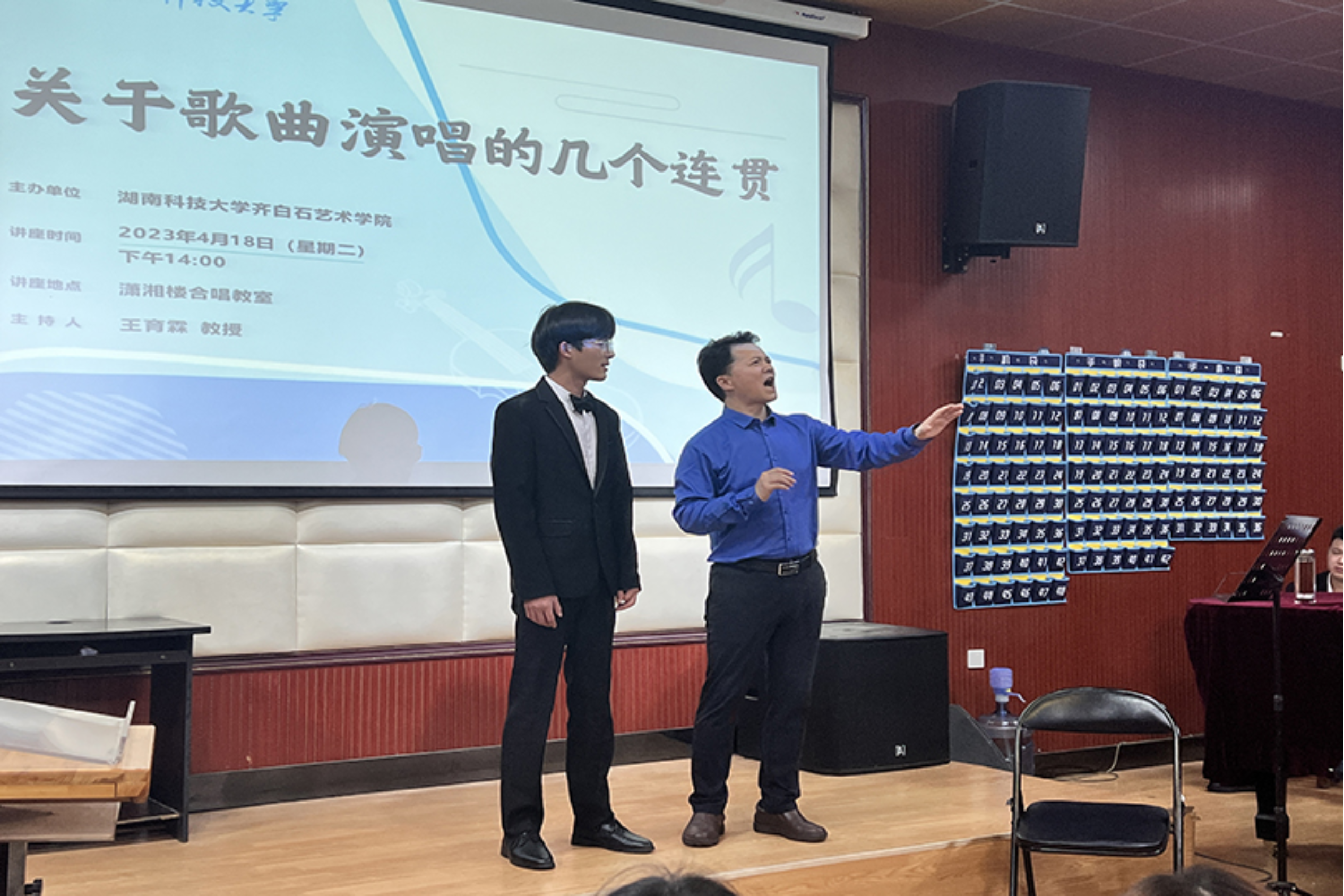 为进一步提升公司音乐系声乐教学质量,提高员工声乐演唱水平,4月18日下午,公司特别邀请到了马关辉教授在音乐系合唱教室开展主题为《关于歌曲演唱的几个连贯》的专题讲座,由公司副经理王育霖教授主持本次讲座。讲座以声乐公开课的形式开展,音乐系师生与会参加。
